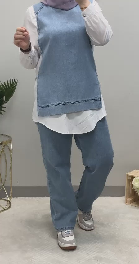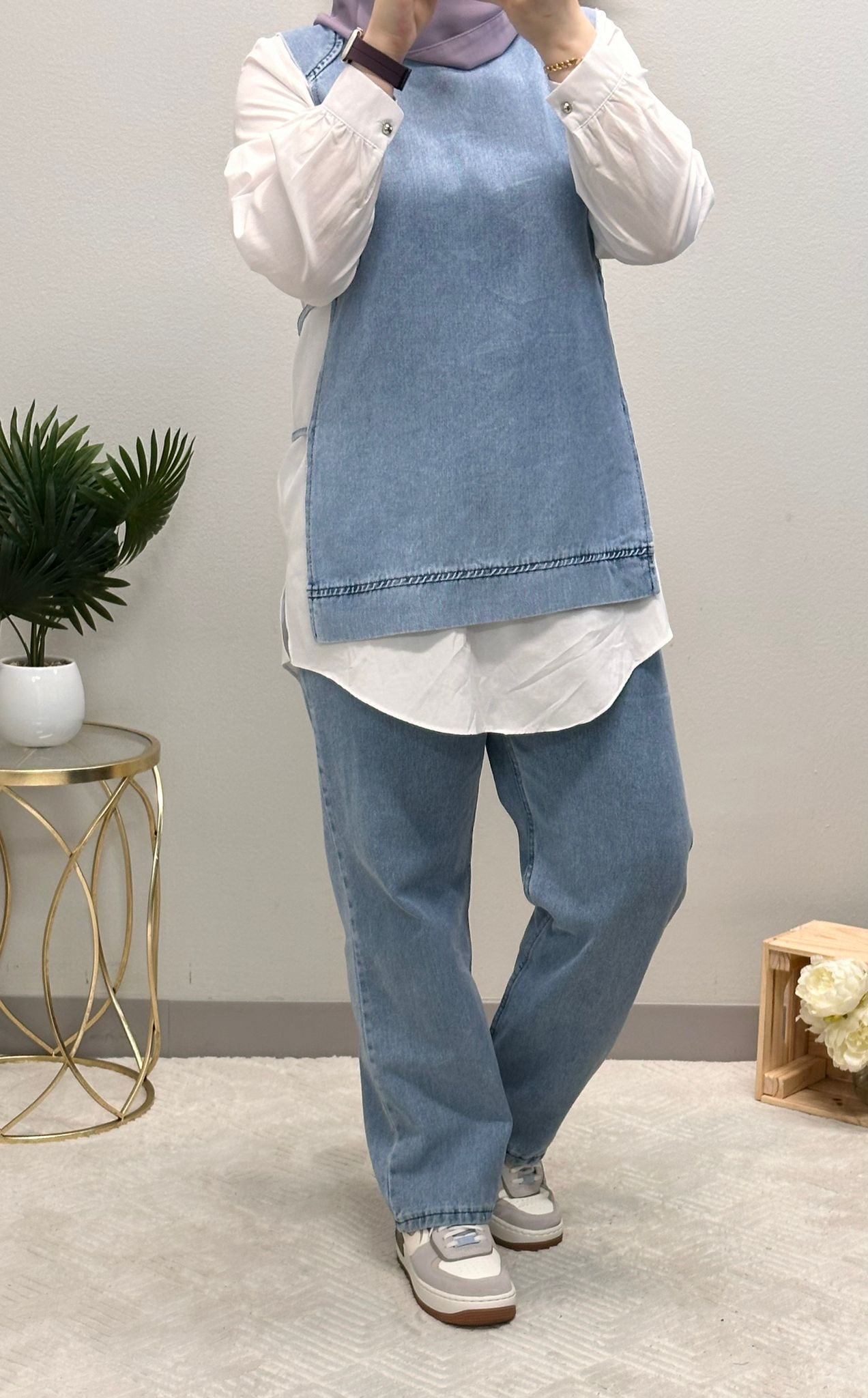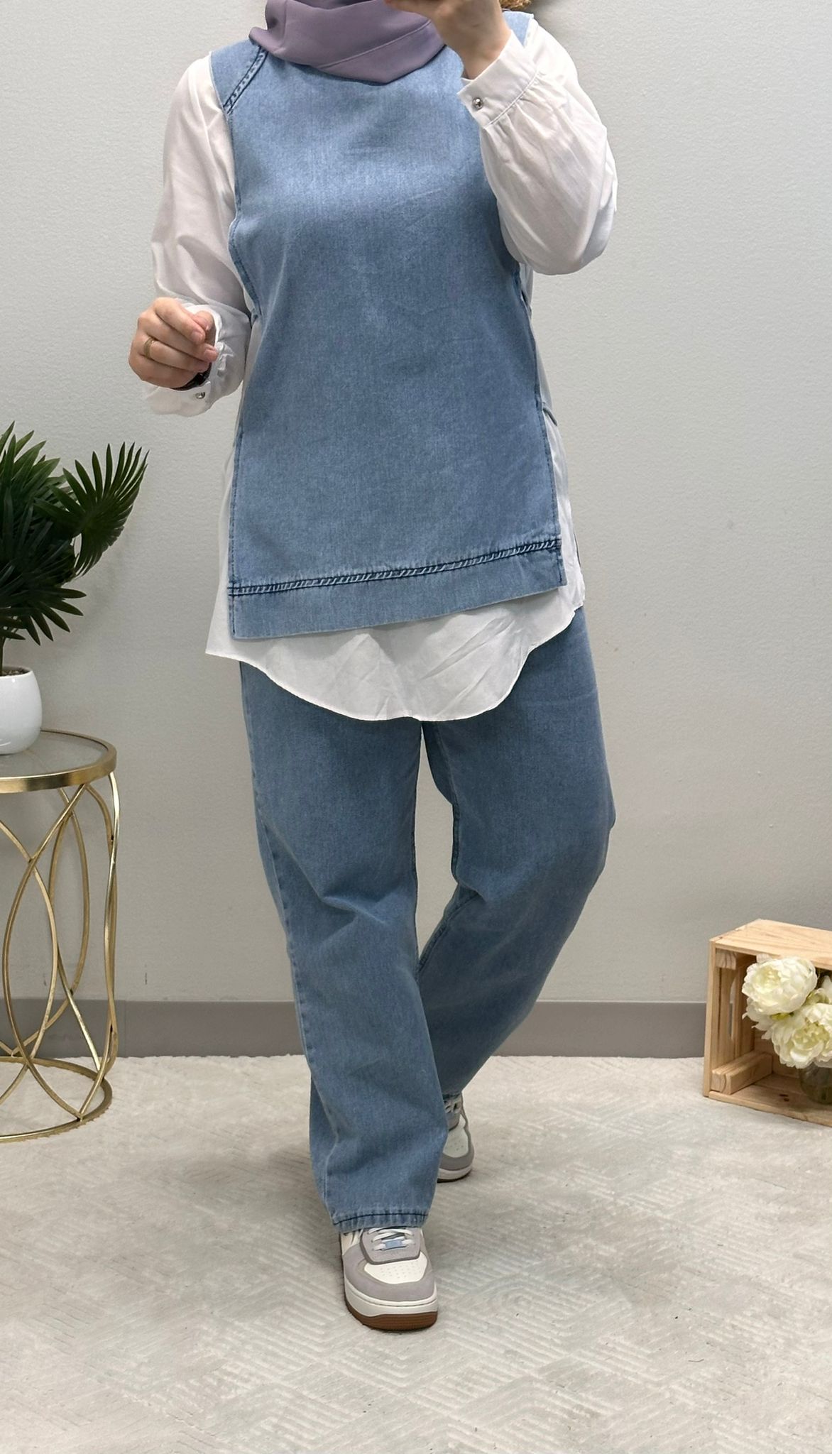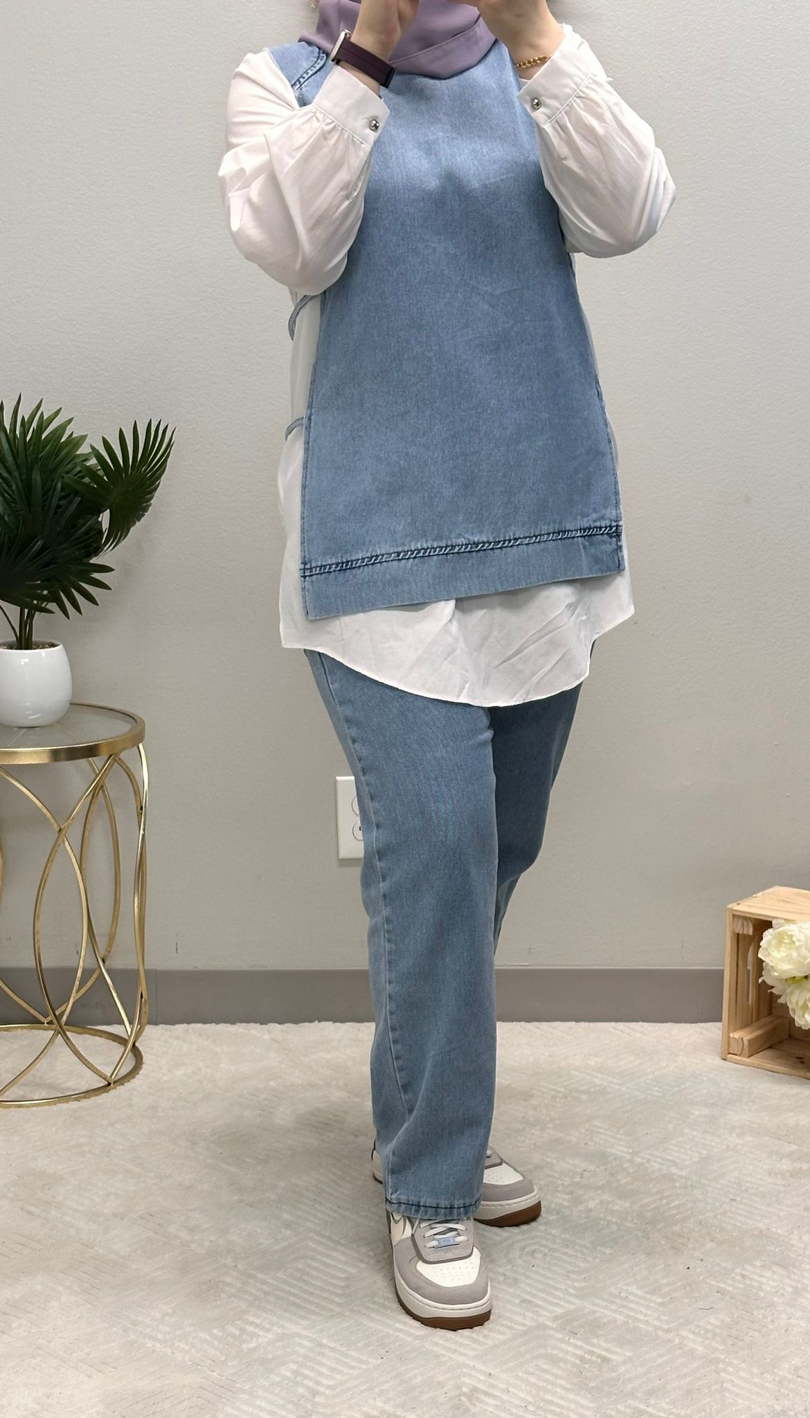 Introducing our stylish Three-Piece Open Jeans Set, designed to elevate your casual wardrobe with timeless sophistication. This set features a classic white shirt paired with regular-cut jeans pants, creating a versatile and effortlessly chic ensemble.