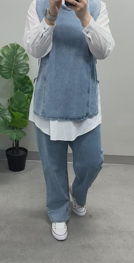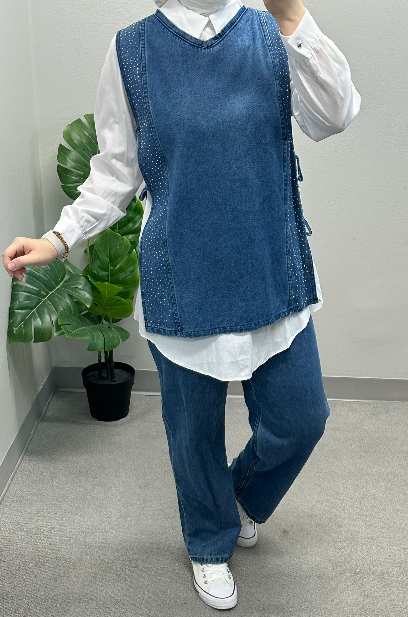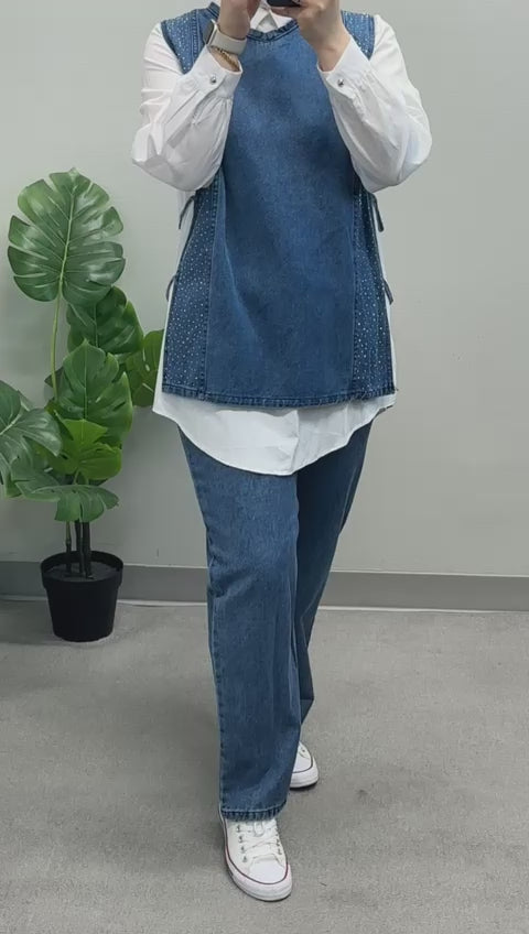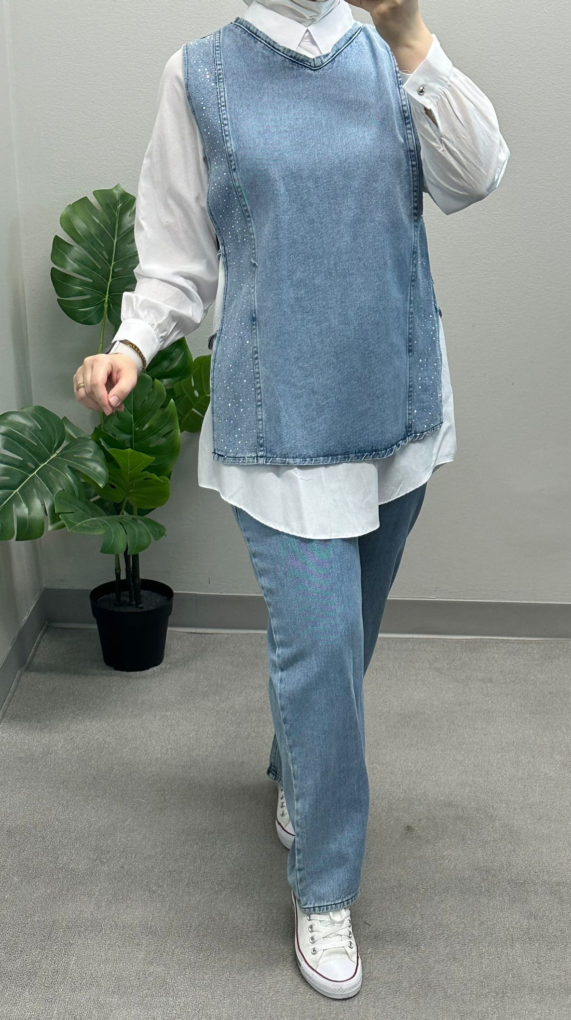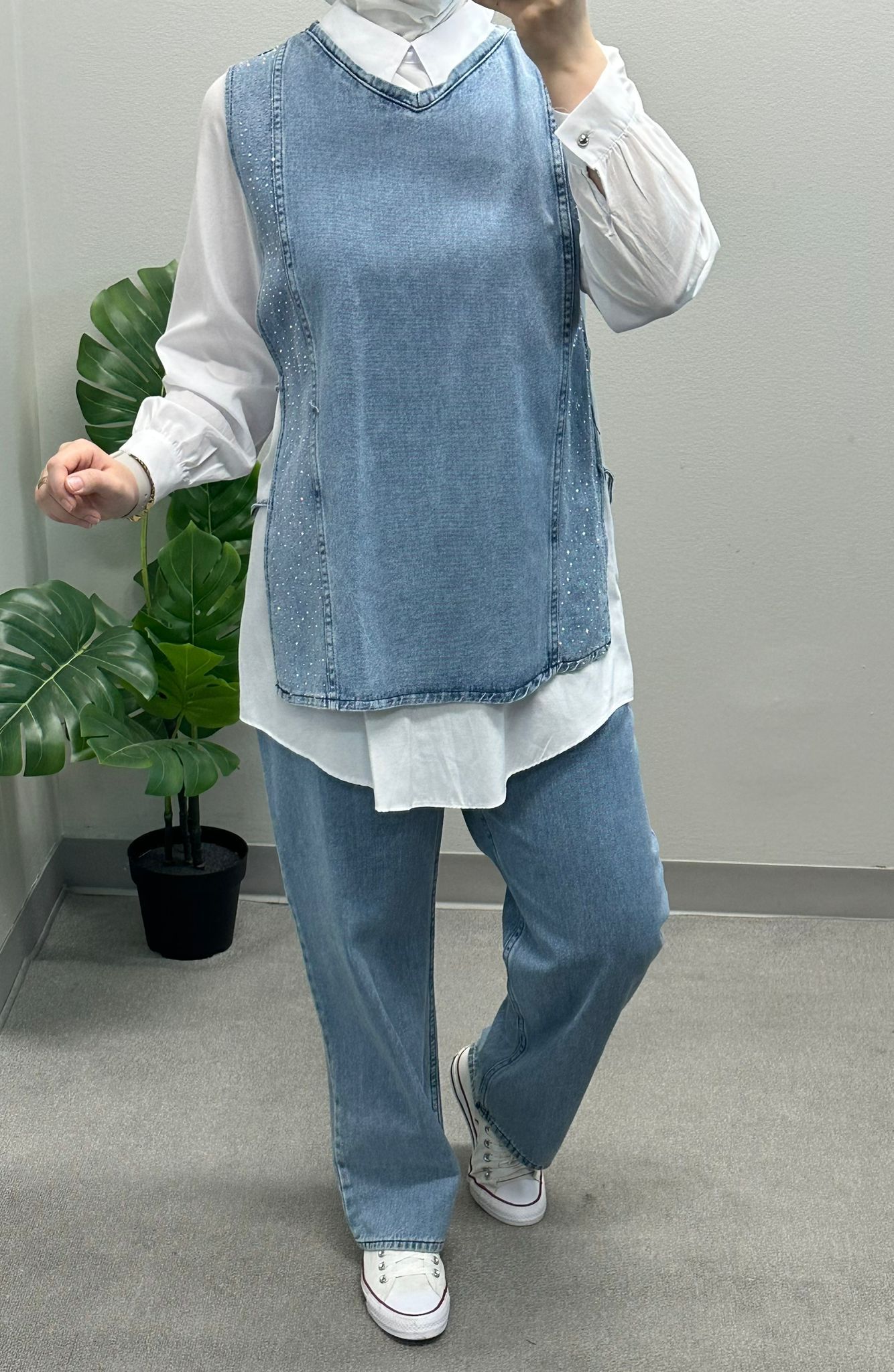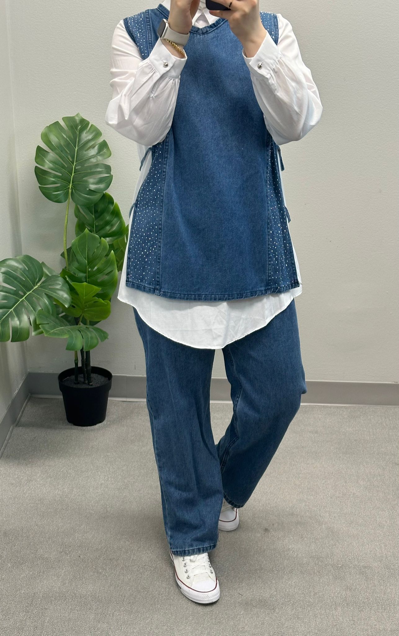 طقم جينز أنيق مكون من 3 قطع وجهين ستراس فاتح مزين أسفل القميص الأبيض