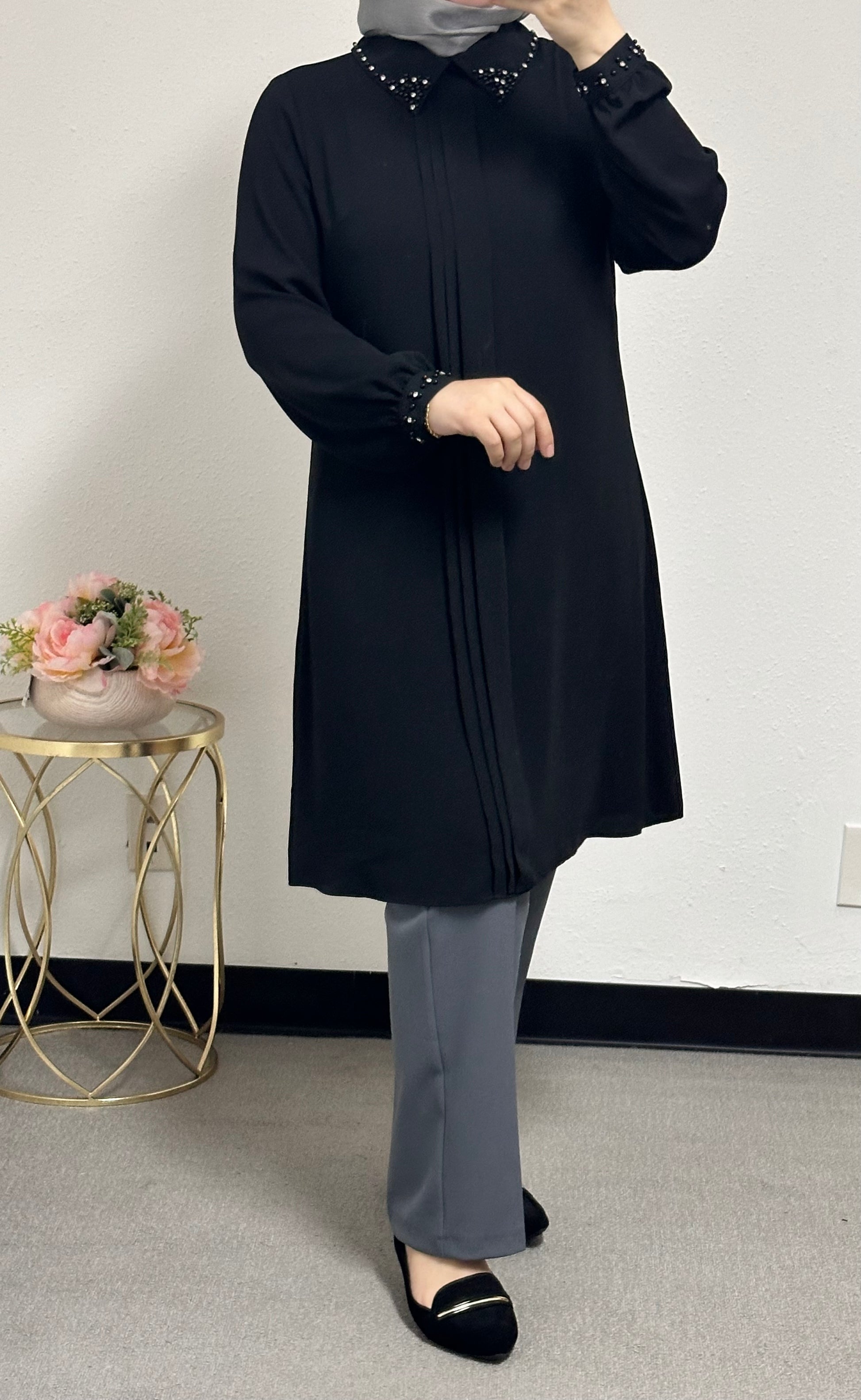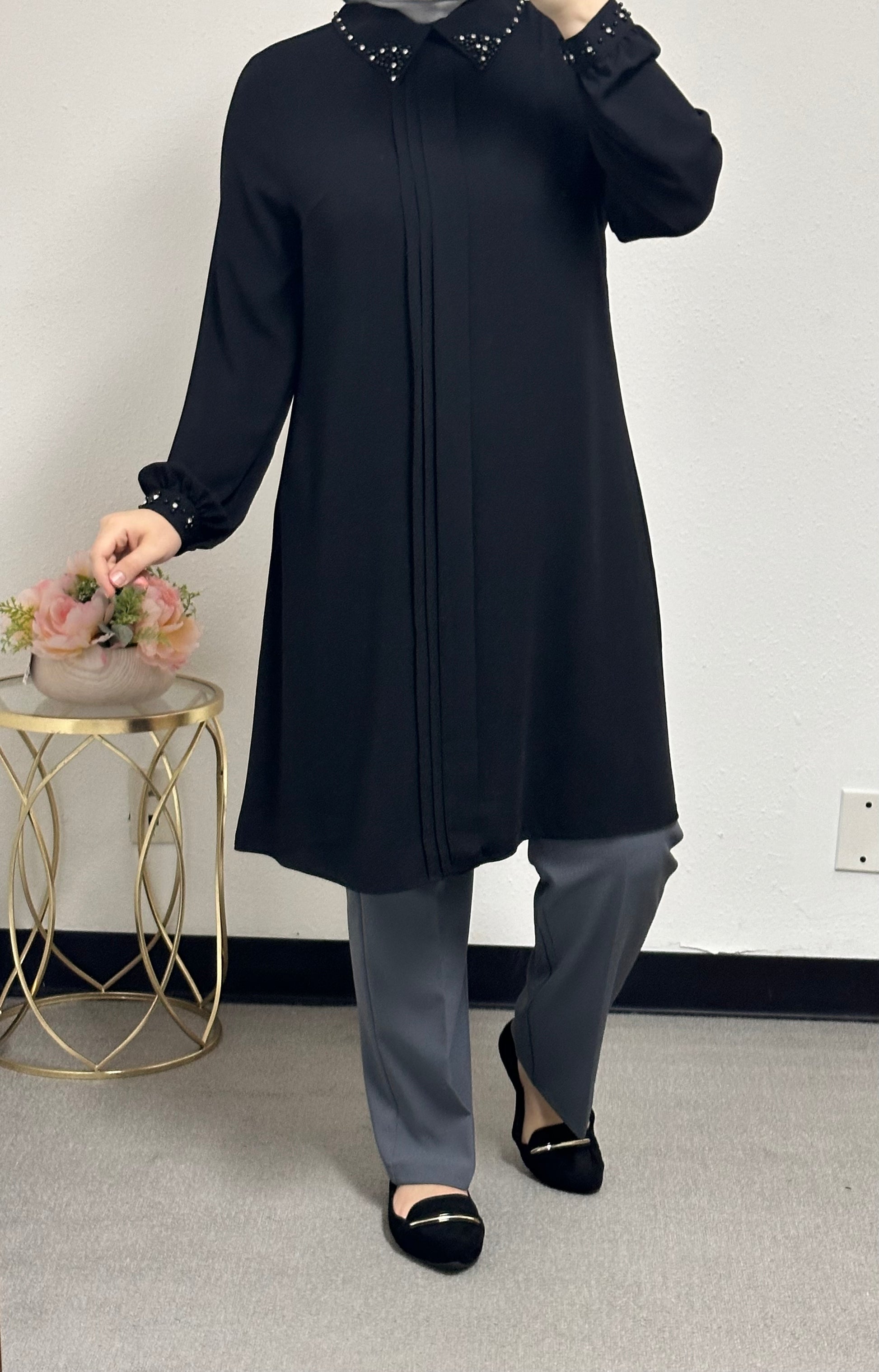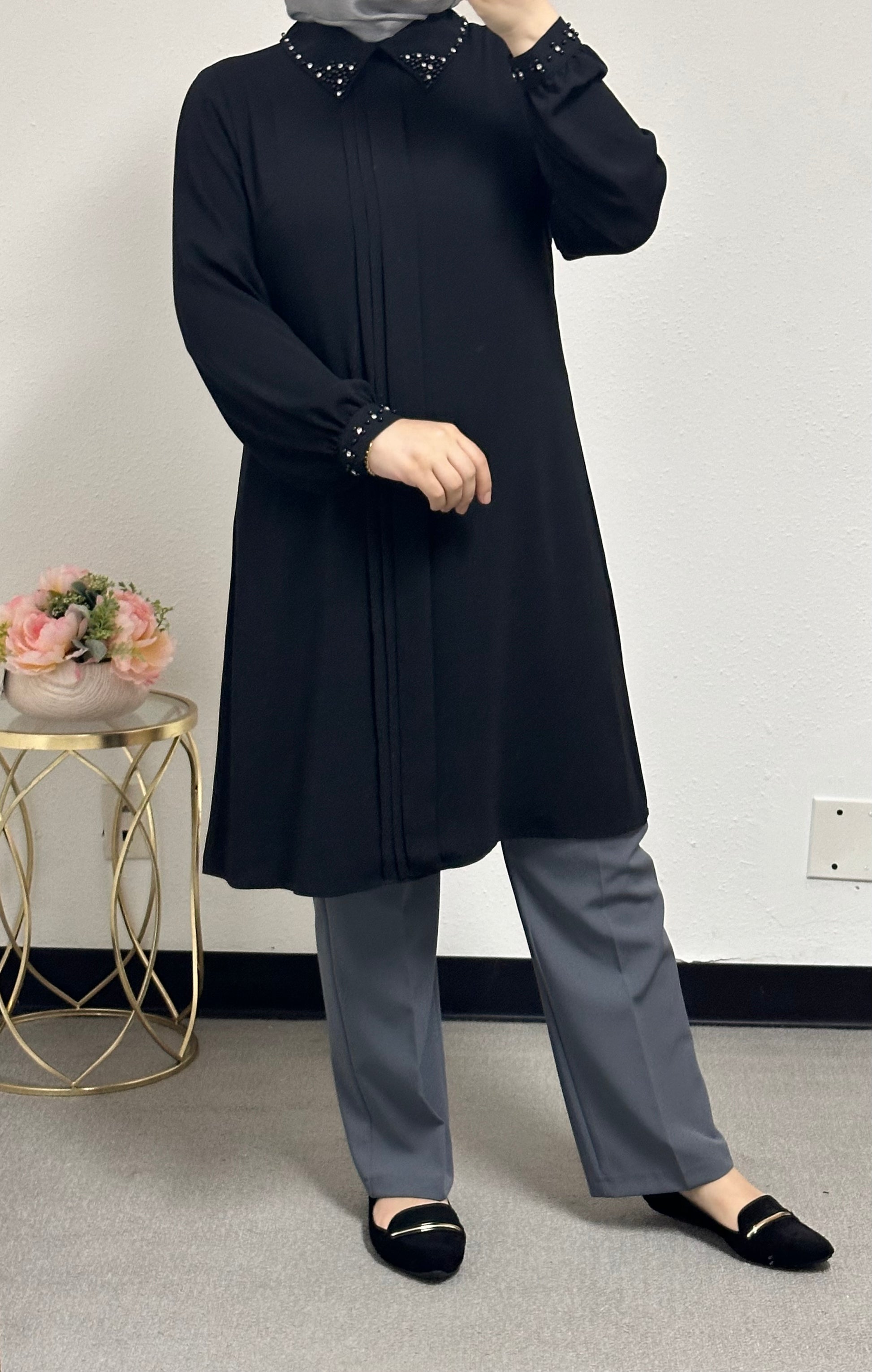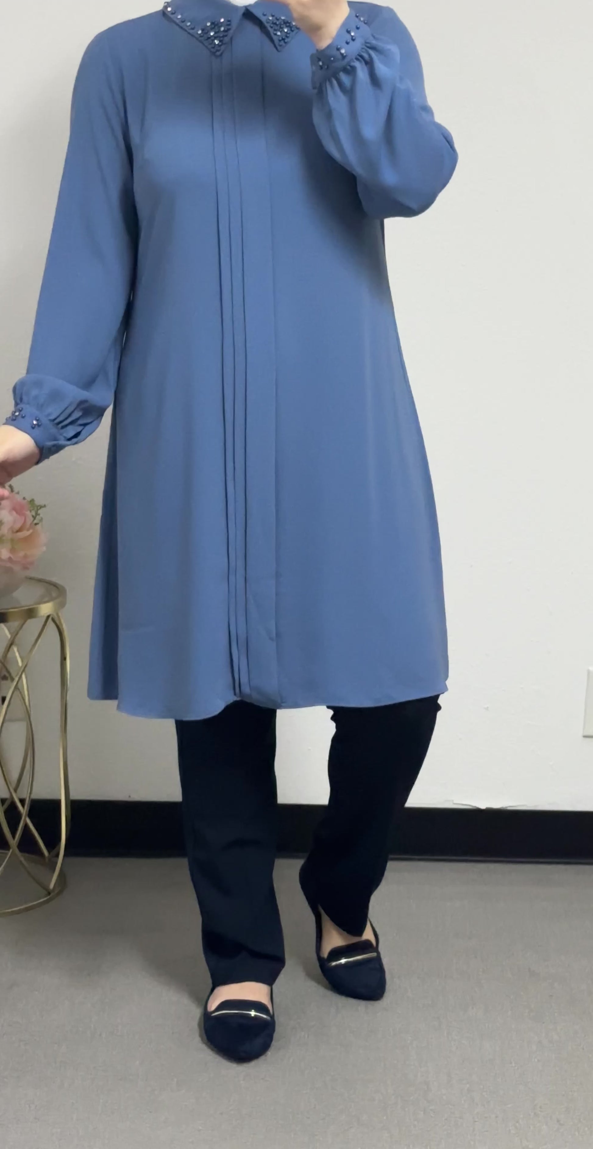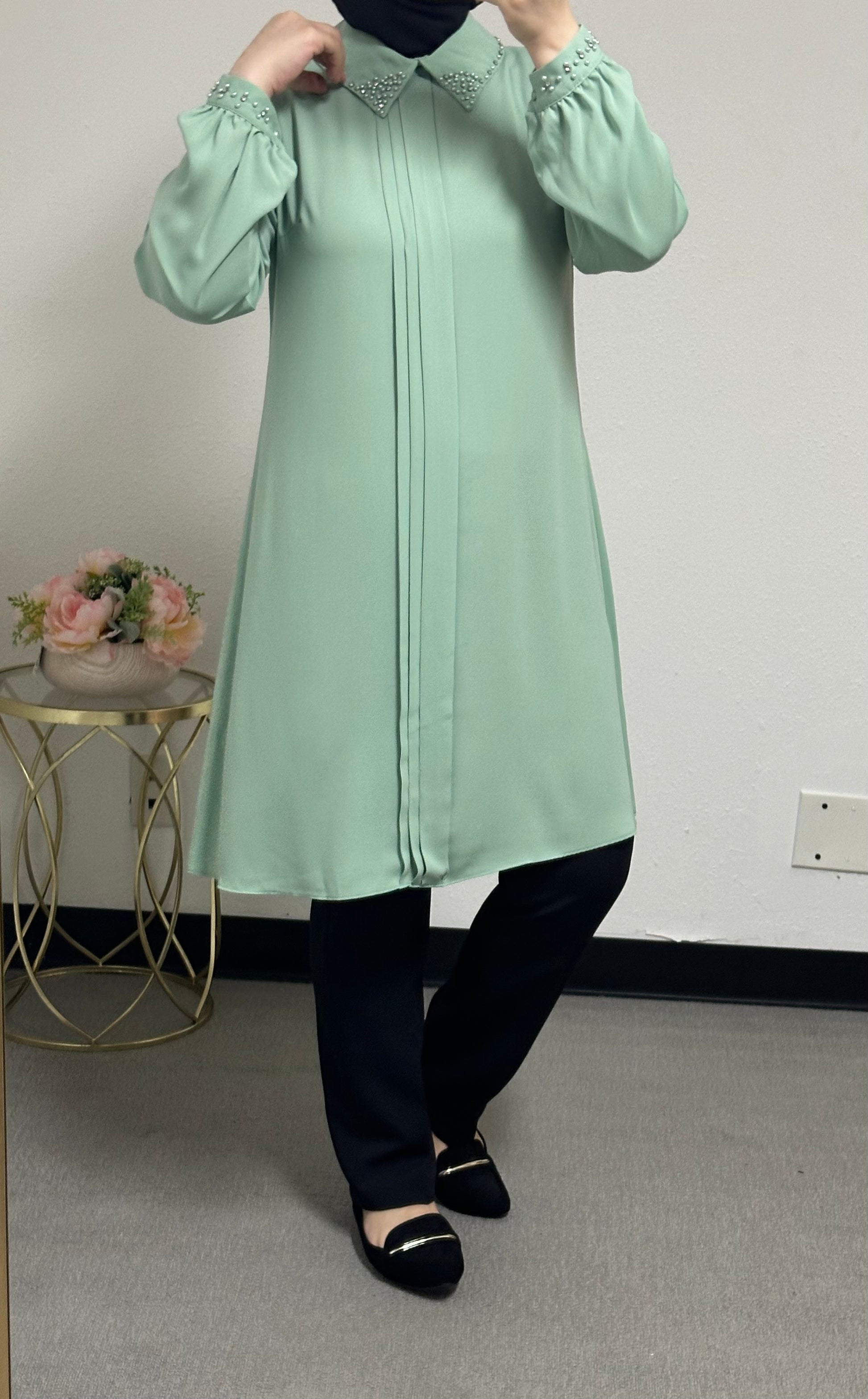 long blouse collar pearl adorned