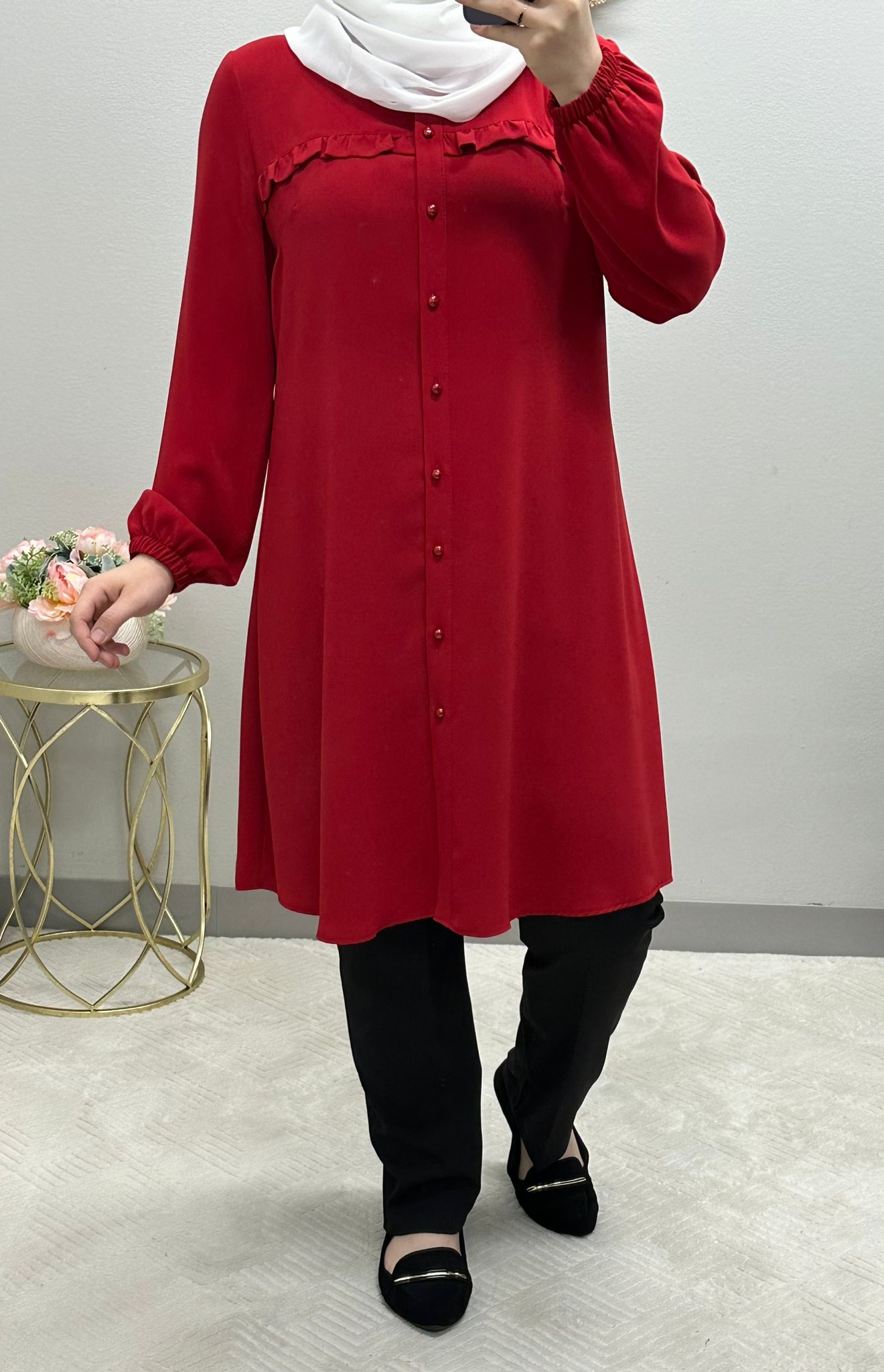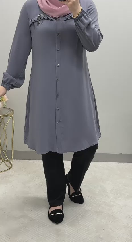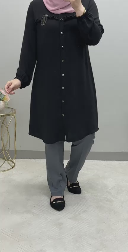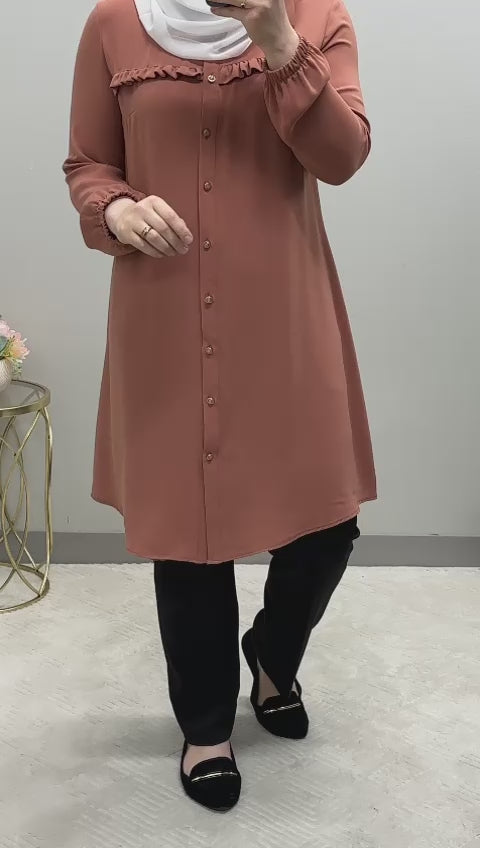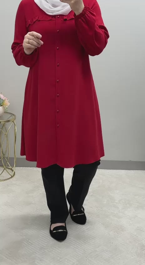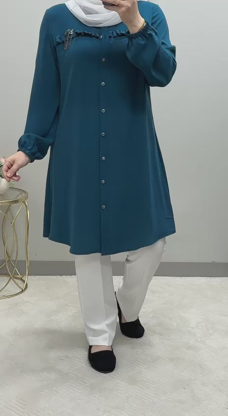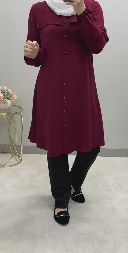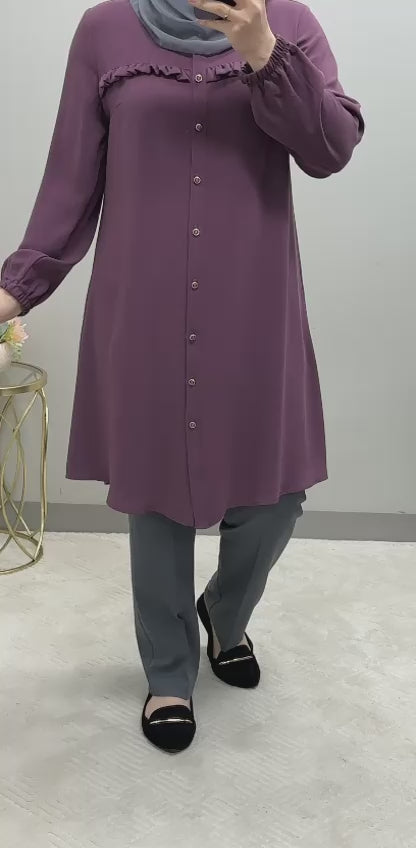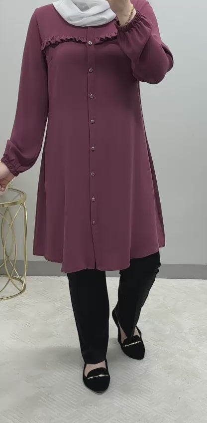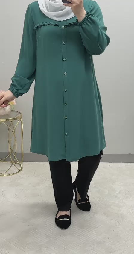 Elevate your modest wardrobe with our loose-style ruffle tunic blouse. Featuring an open front with same-color buttons, this versatile piece is available in nine stunning colors. Embrace effortless style and comfort for every occasion
