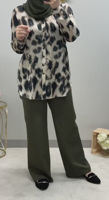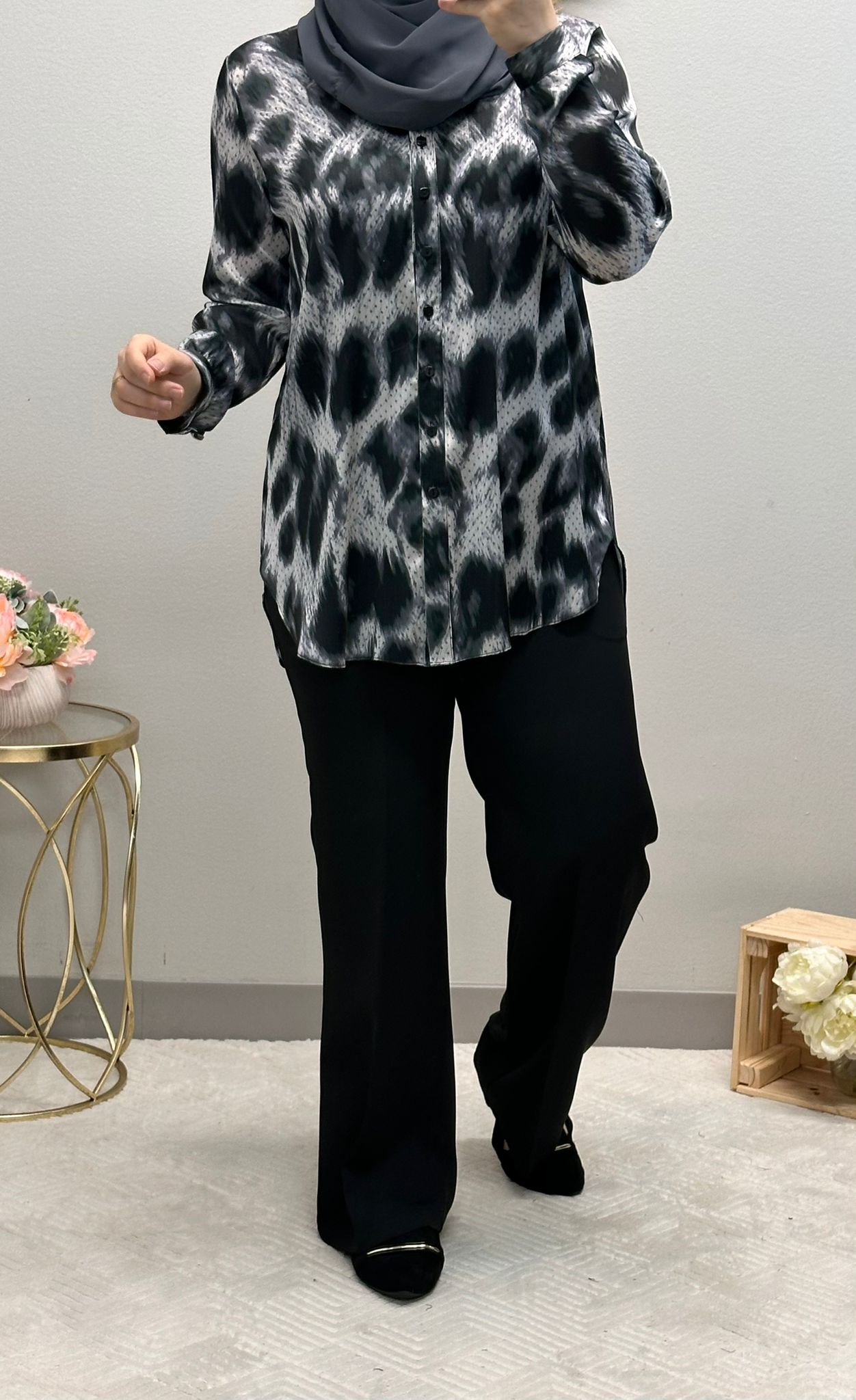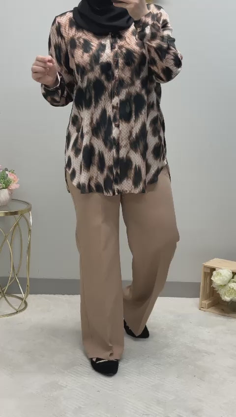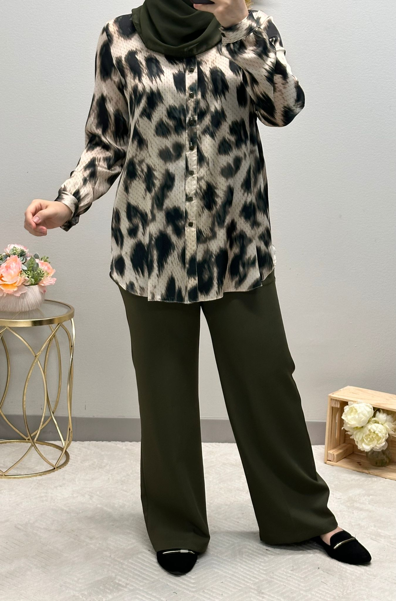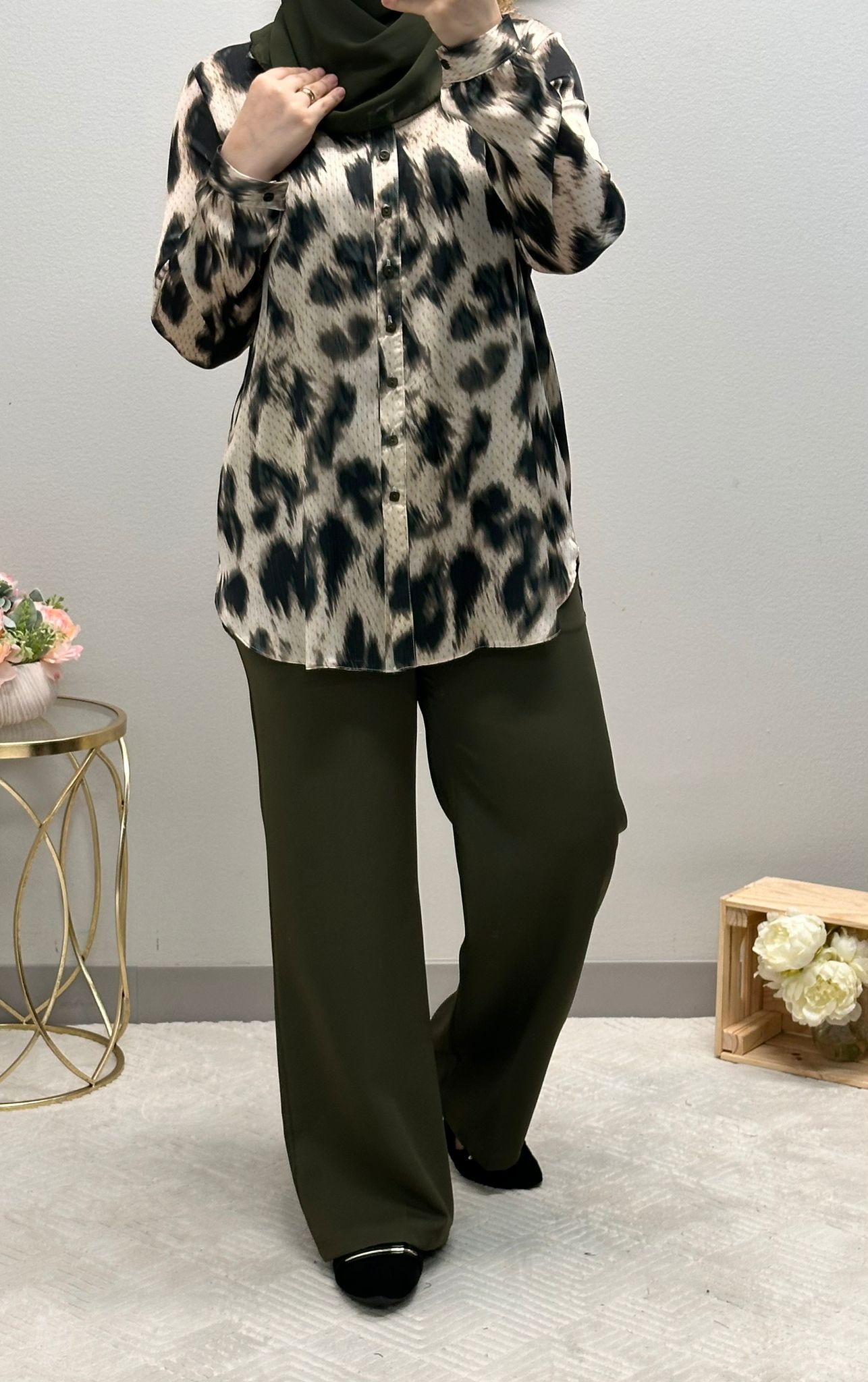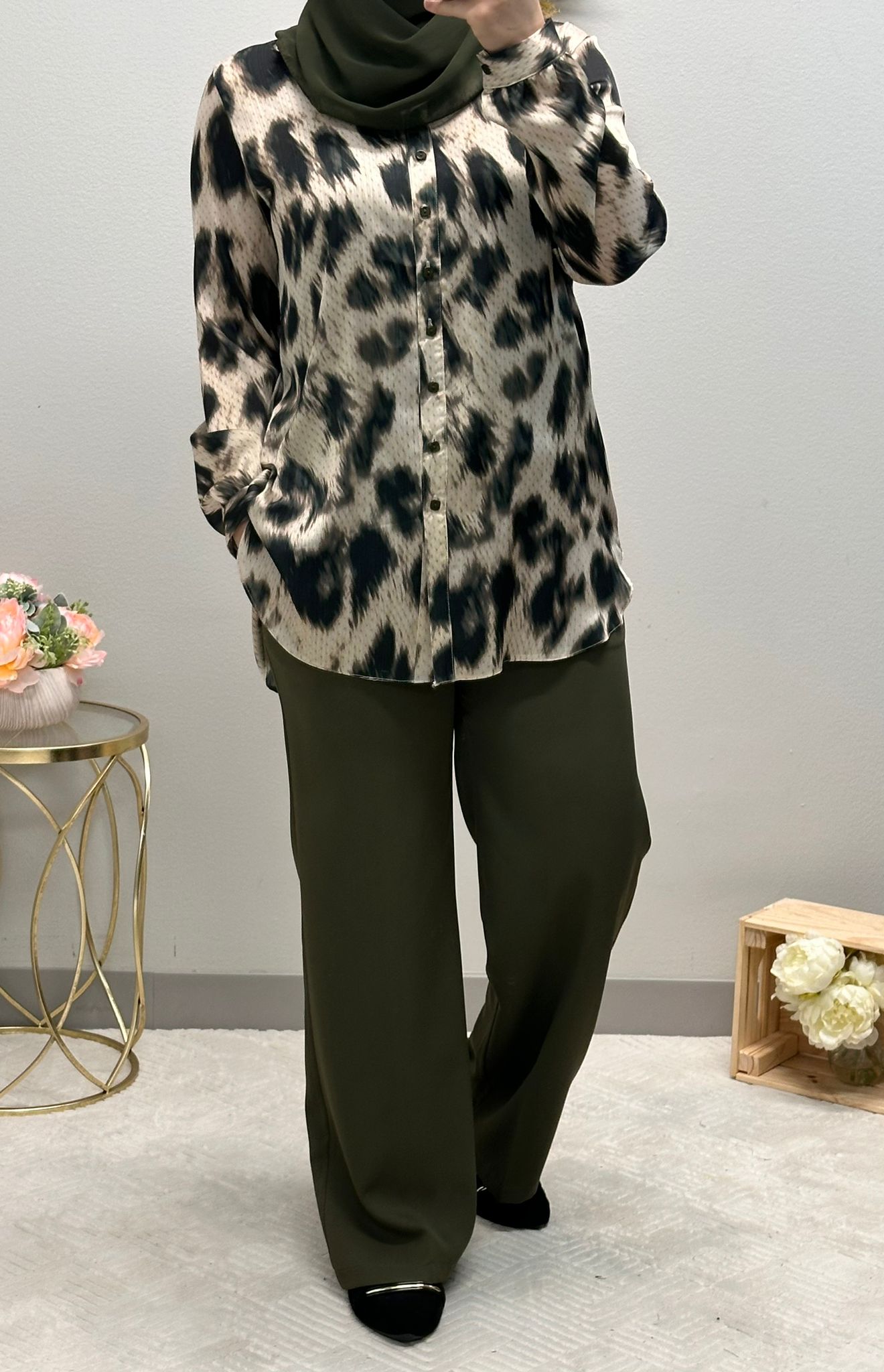 Introducing our luxurious Two-Piece Suit Set, crafted from high-quality soft material for unparalleled comfort and style. This set features a front button shirt adorned with a striking tiger pattern, adding a bold and captivating touch to your ensemble.