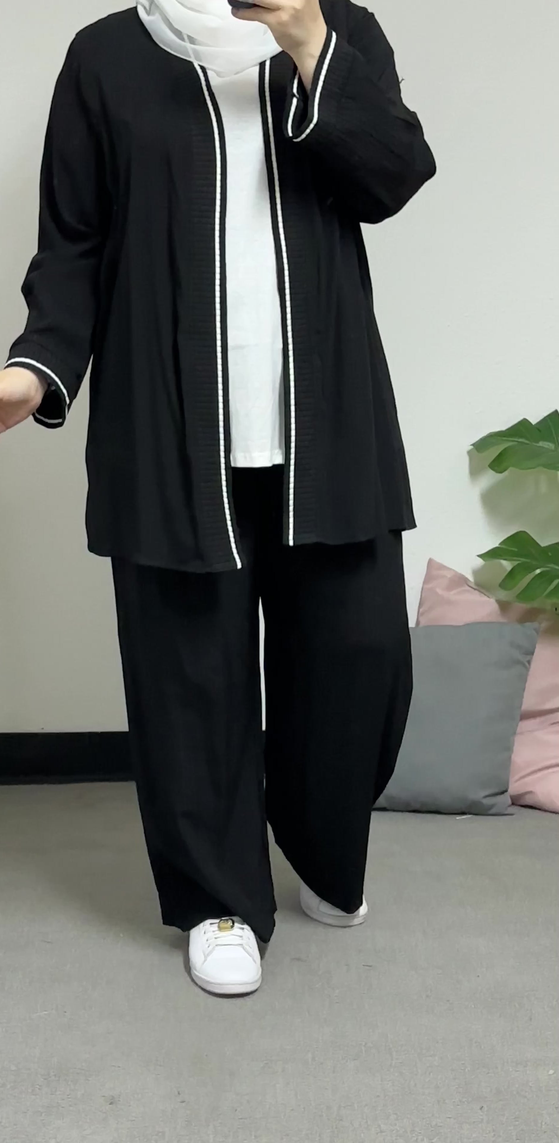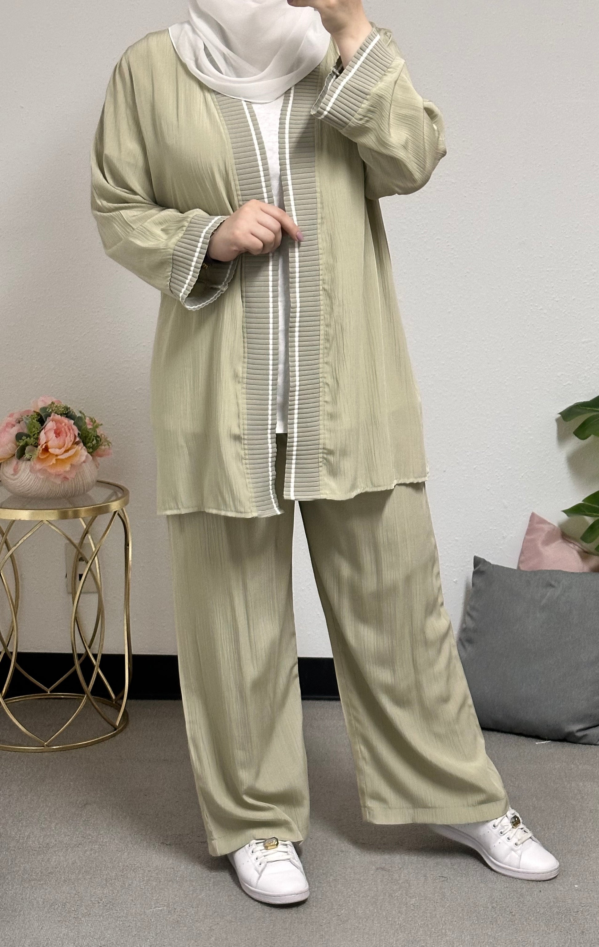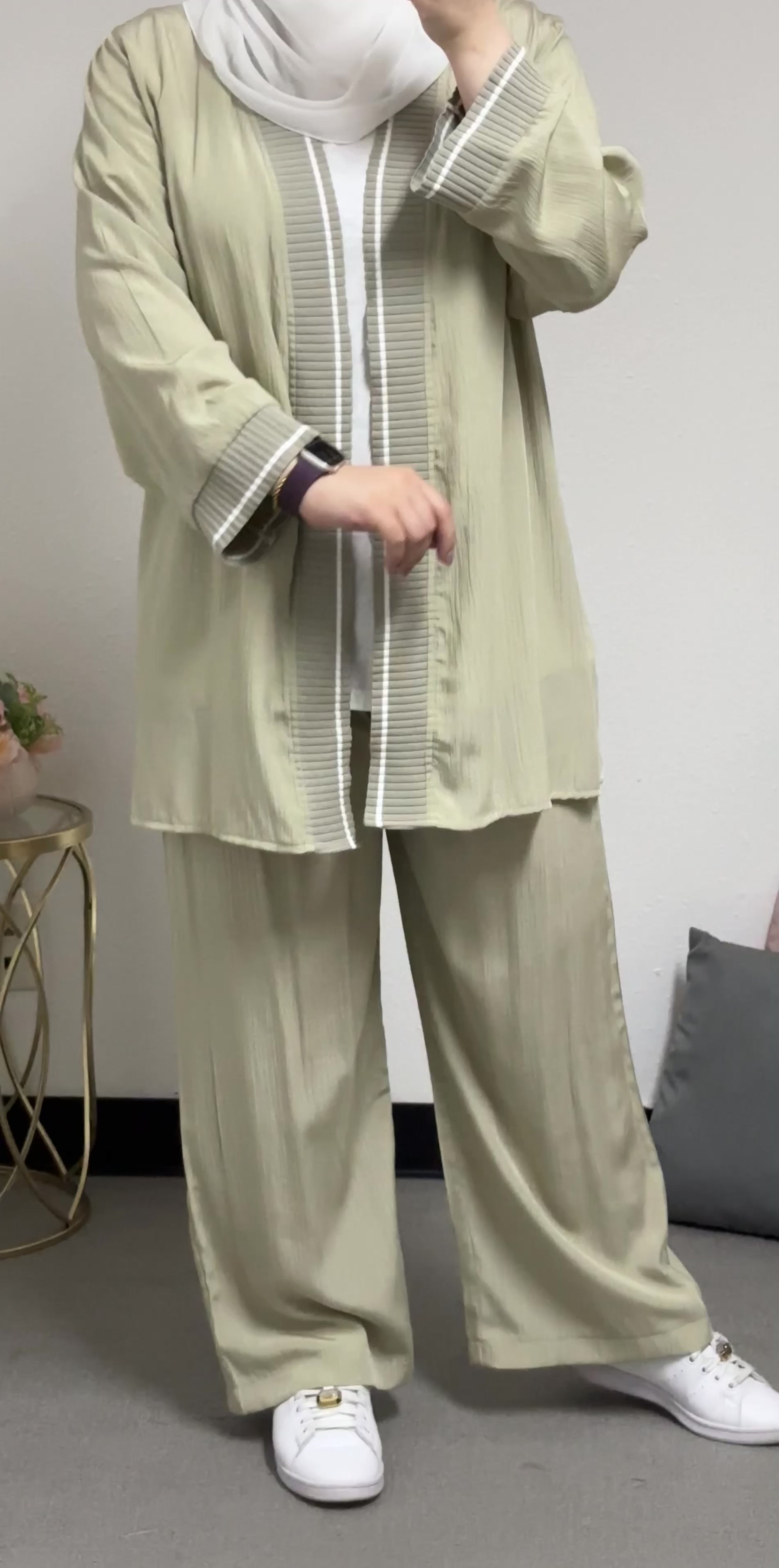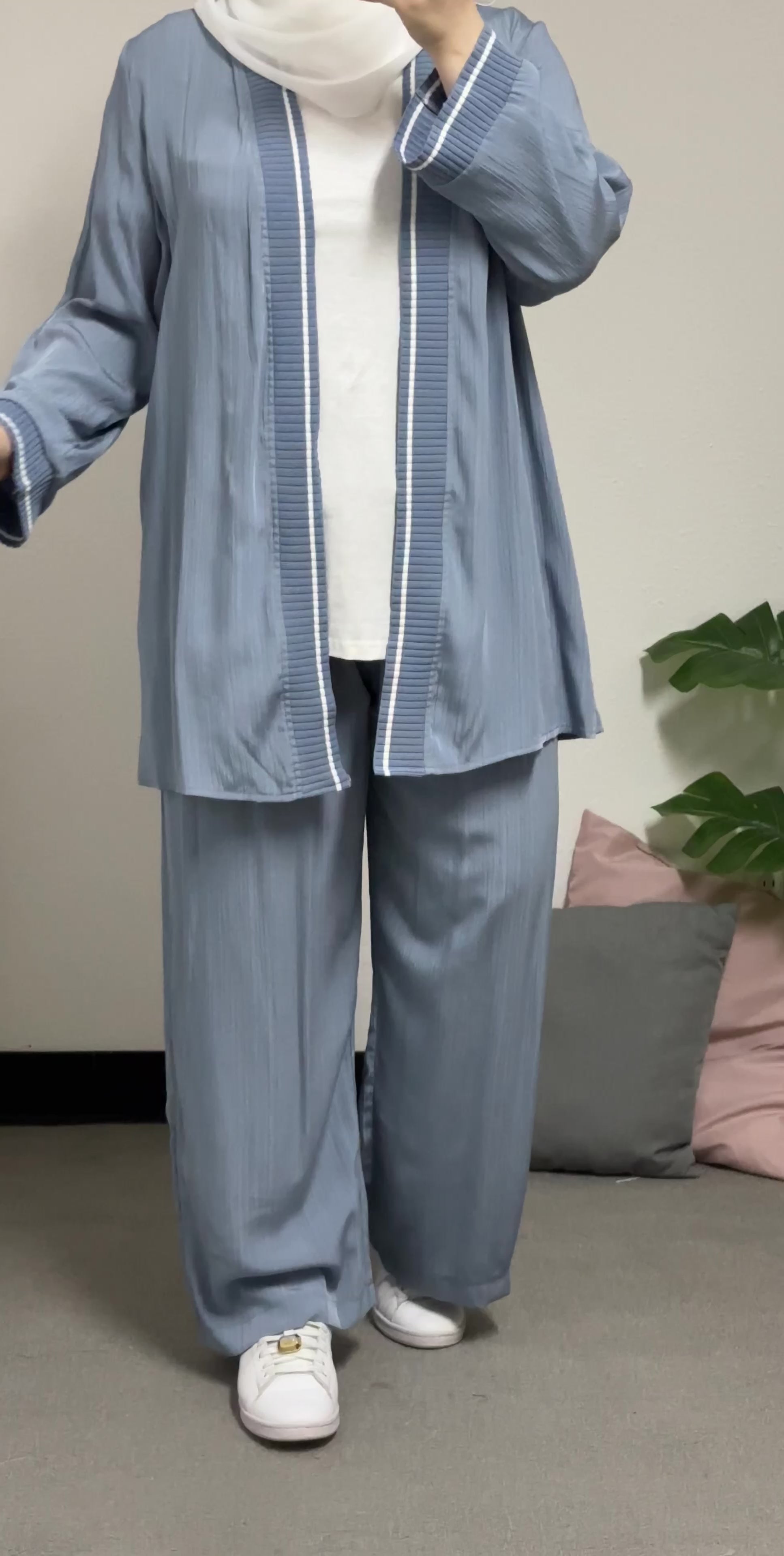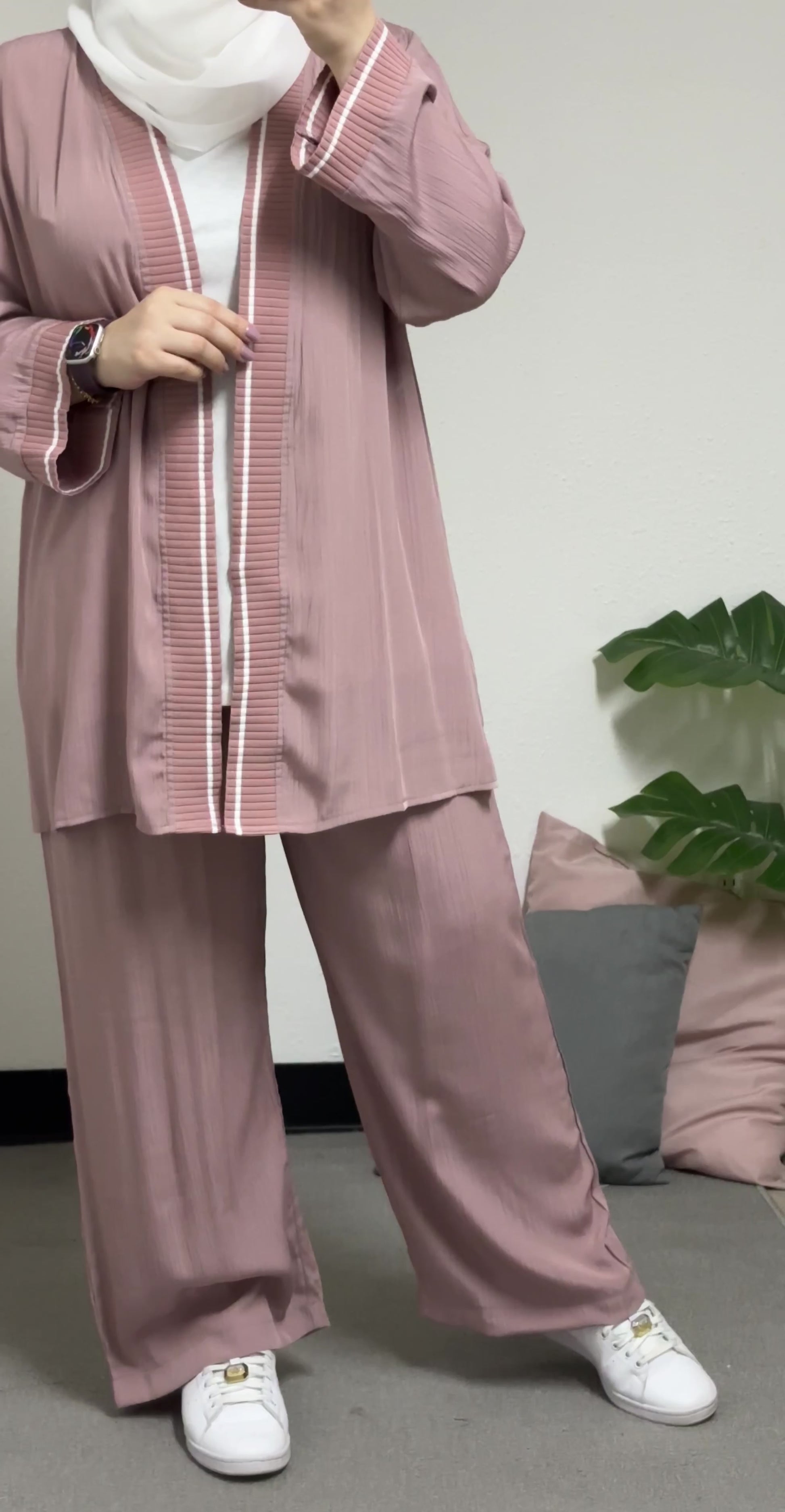 “Three-piece set including a short cardigan, inner blouse, and pants.”