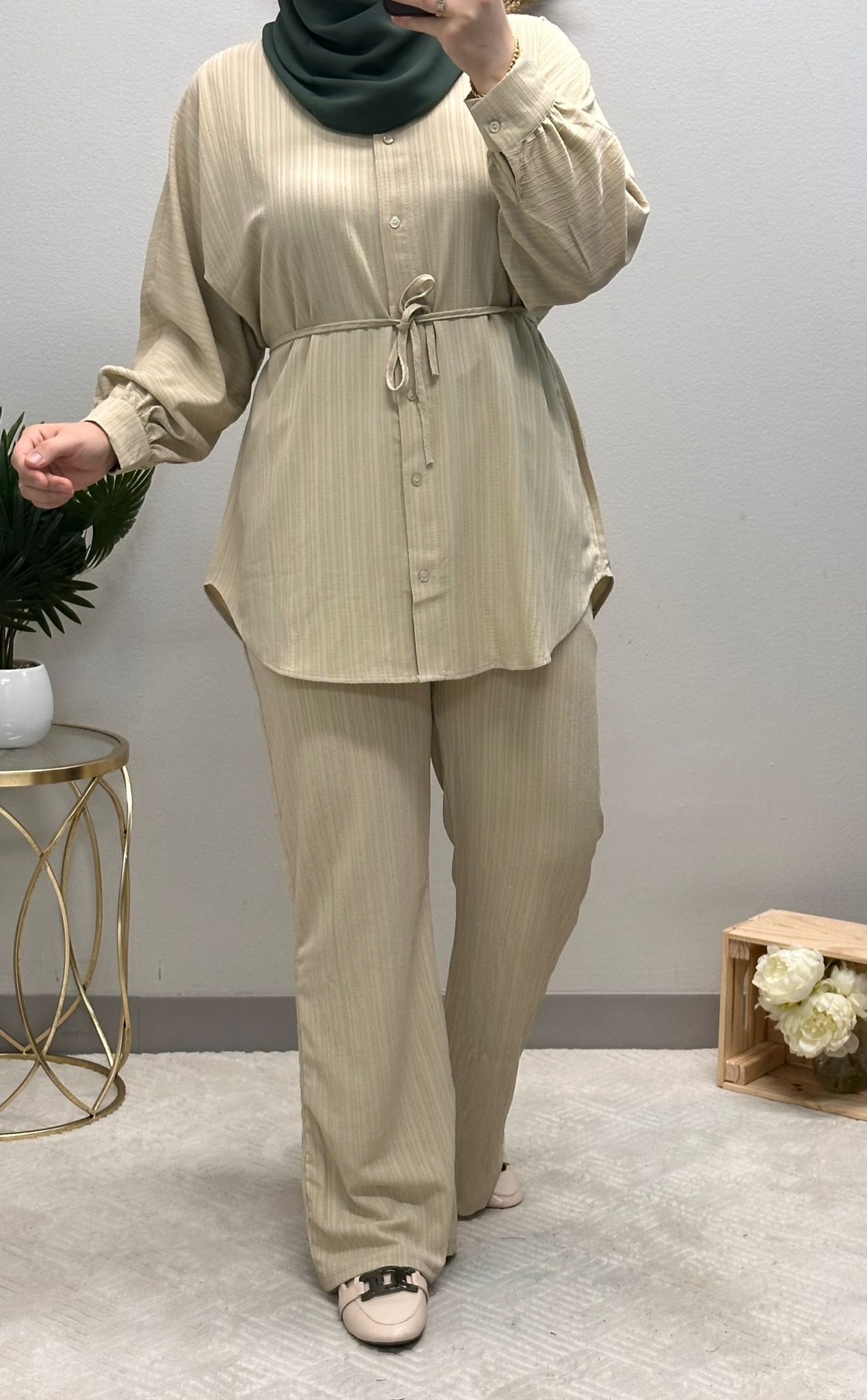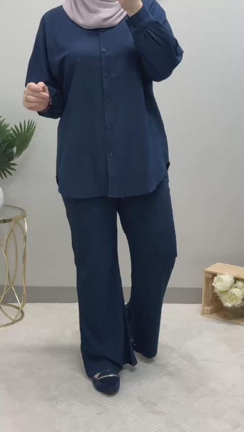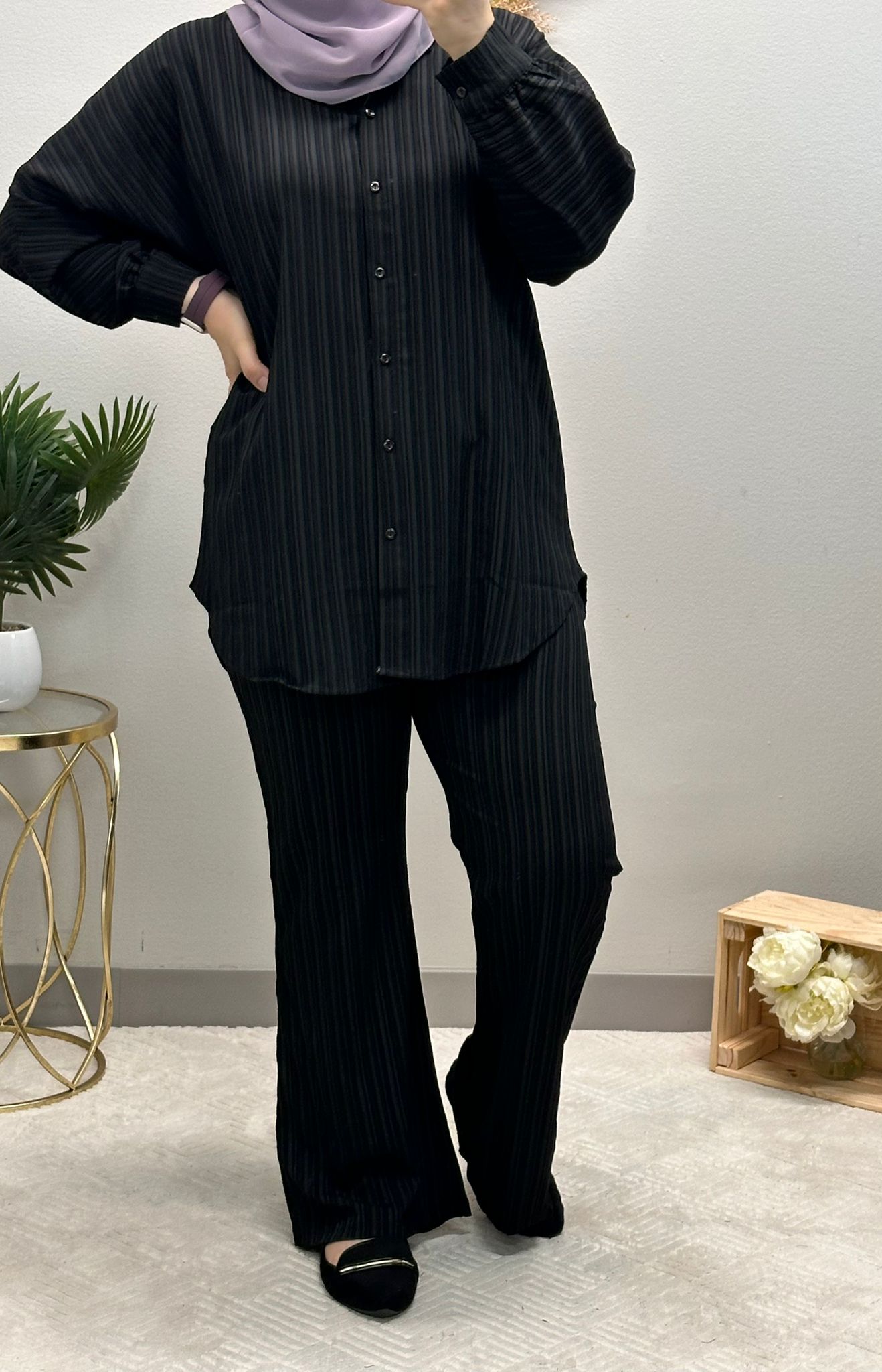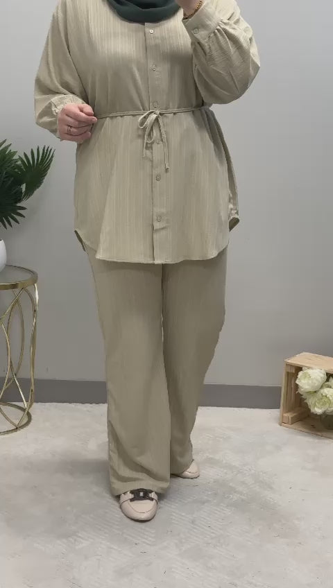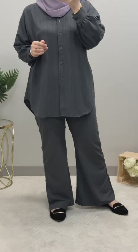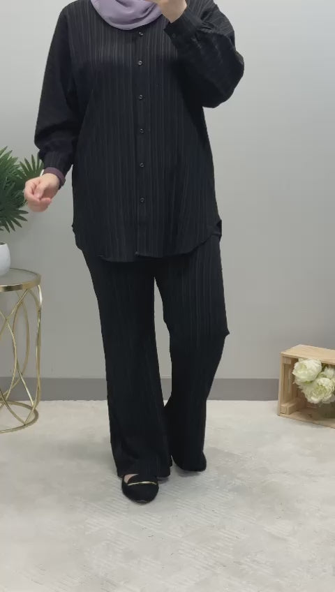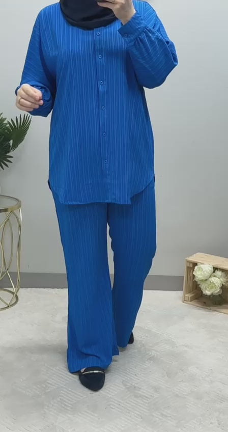 The set features a medium-length shirt adorned with classic front buttons, exuding sophistication with a touch of effortless charm. Its timeless striped pattern adds a touch of elegance to your ensemble, making it a versatile choice for both formal and casual occasions.