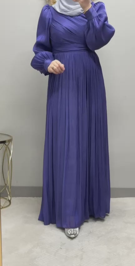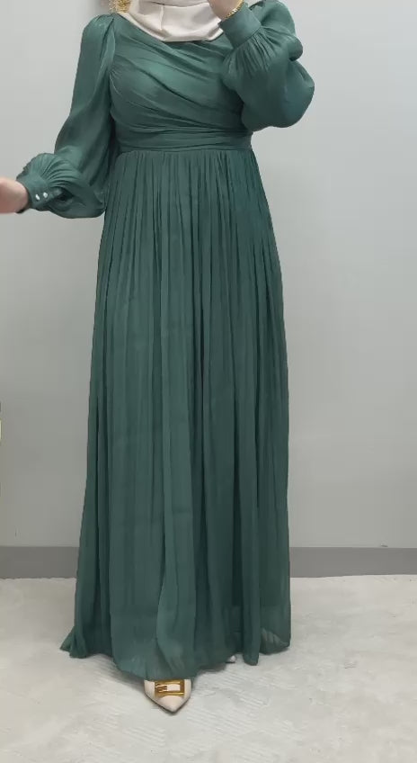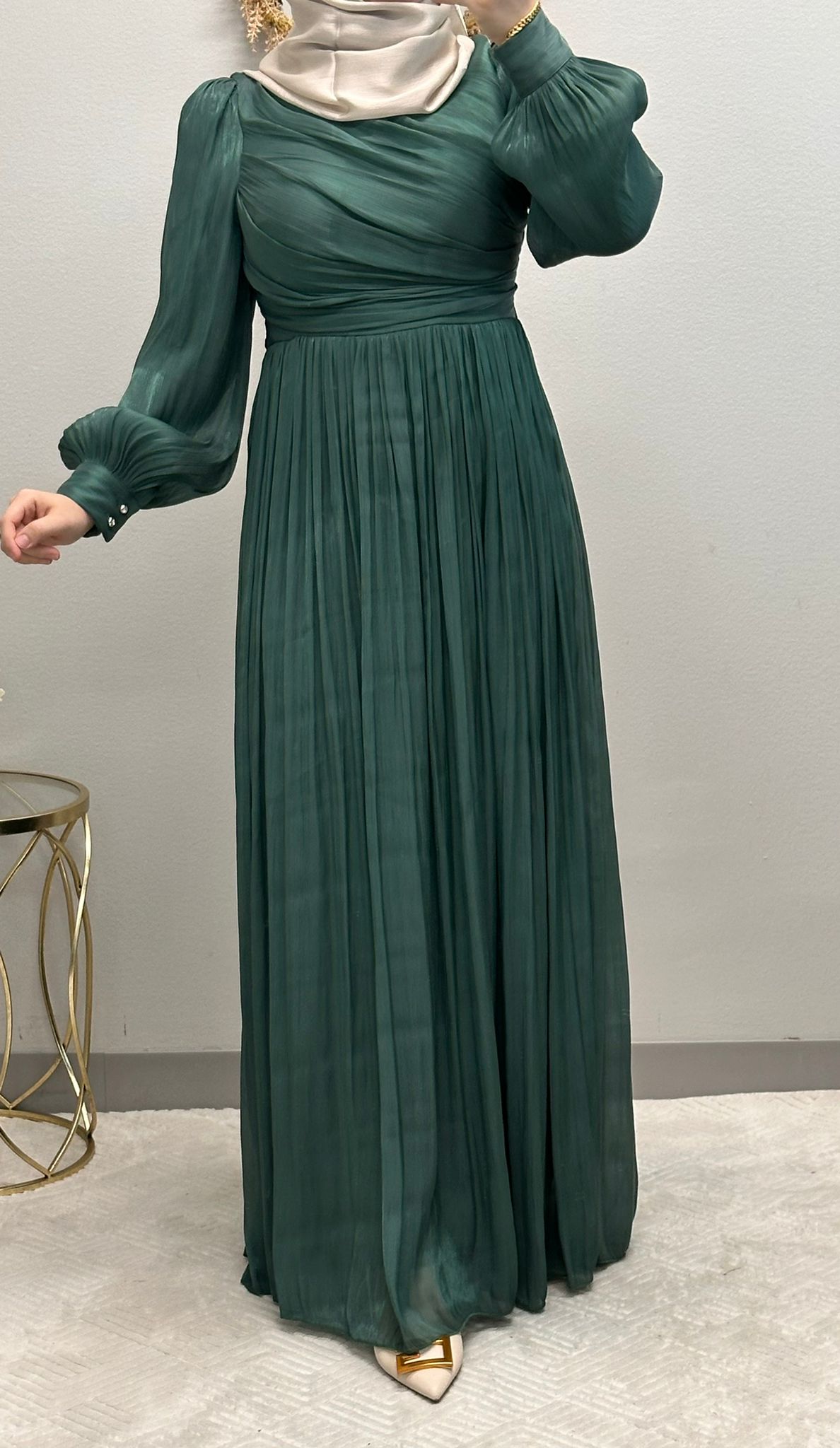 Kloch satin formal dress, fully lined and pleated for a flawless finish. With its folded top and puff lantern sleeves, this dress exudes refined elegance, perfect for your most special occasions.