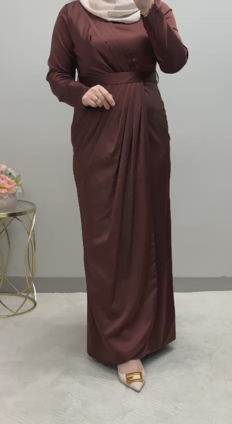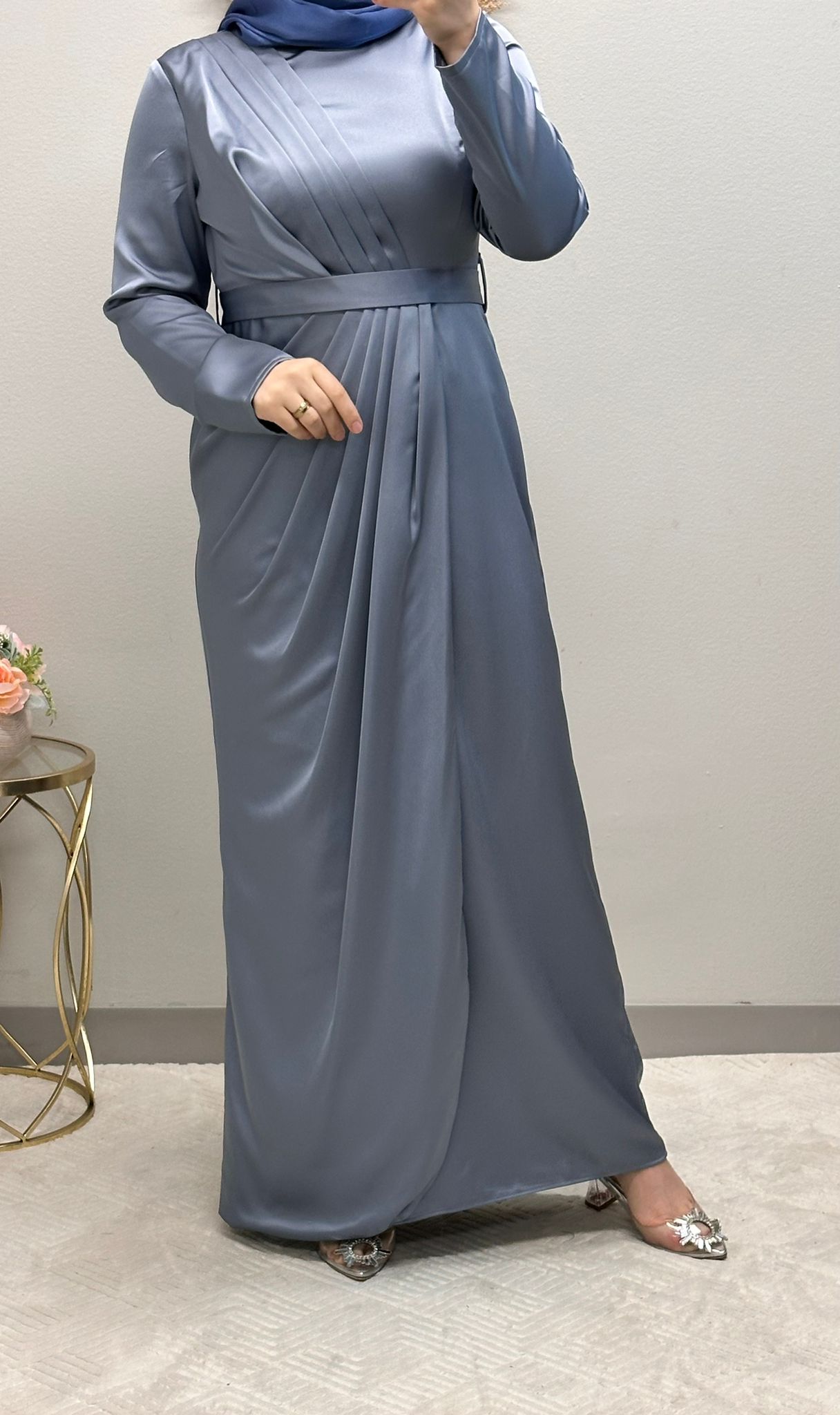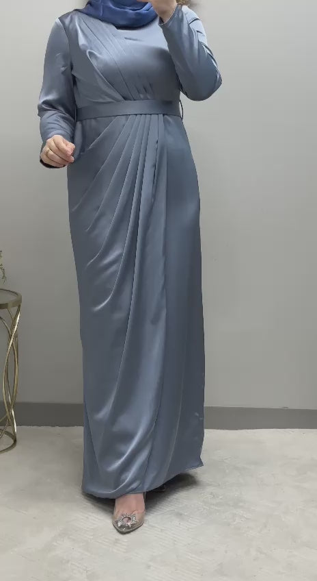 Elegant folded and pleated satin formal dress, This exquisite ensemble includes a detachable belt, offering versatility and sophistication for any special occasion