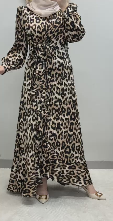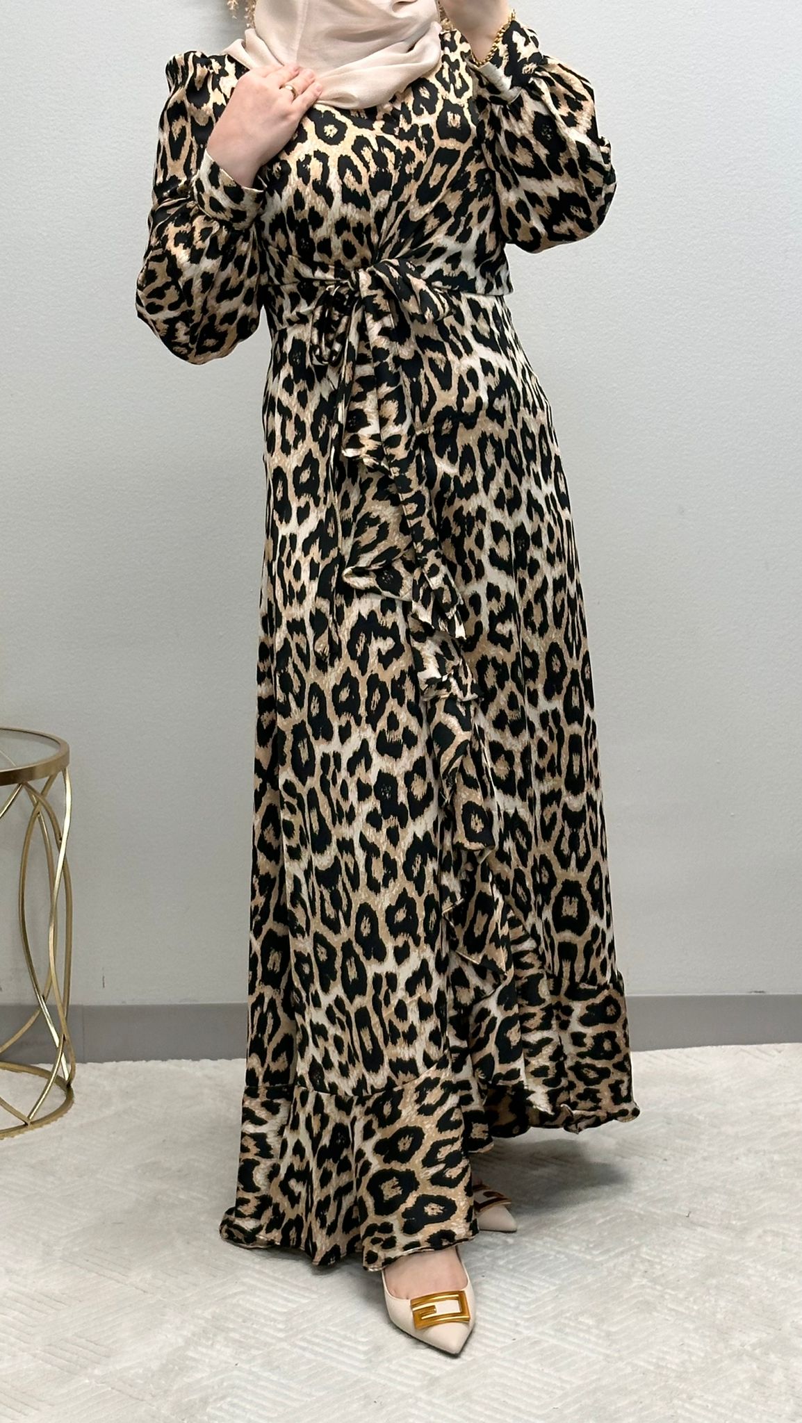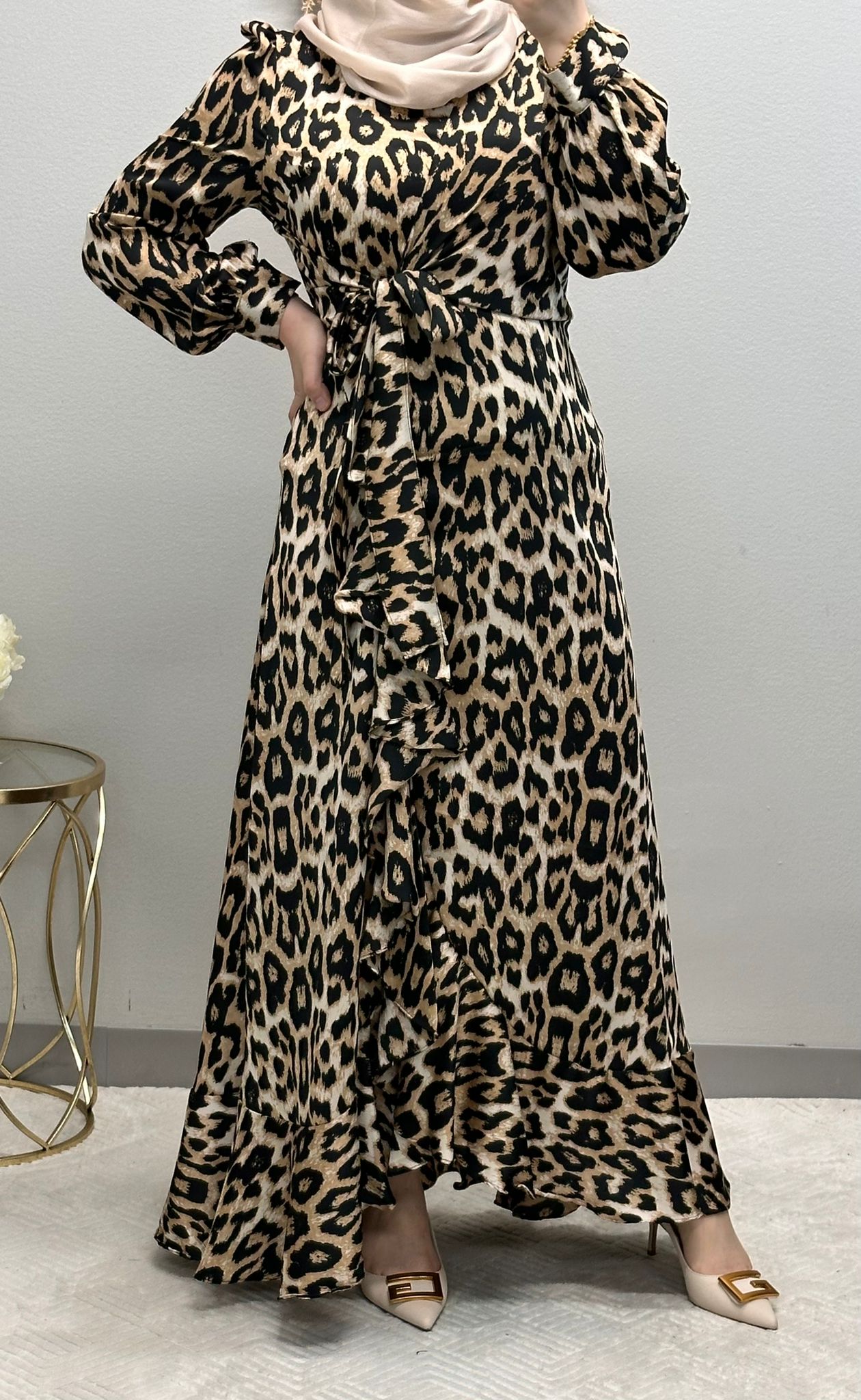 Satin ruffled tiger dress. Featuring captivating ruffles and a stylish self-tied belt, this dress is the epitome of fierce sophistication