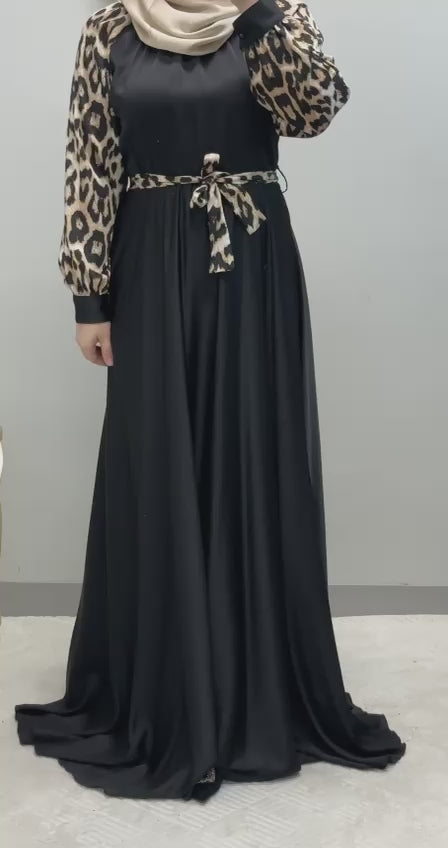 Effortlessly chic, our maxi satin dress features a flattering klosh silhouette with striking black and tiger print sleeves. Complete with a detachable belt, it's the perfect blend of style and versatility.