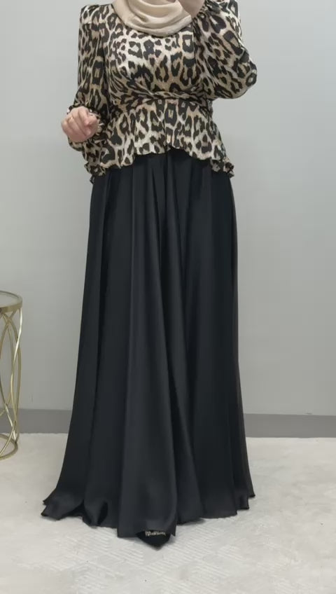 Stain Tiger and Black maxi dress with a detachable belt. Featuring a striking tiger print at the top transitioning into solid black at the bottom, this dress offers a unique and stylish contrast.